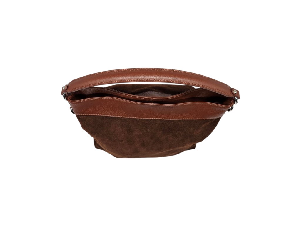 Prostorná kožená taška v kombinaci semiše a kůže, která má kapsu na zip a magnet. Hodí se na nošení jak na rameni, tak i do ruky. Součástí je i přiložený...