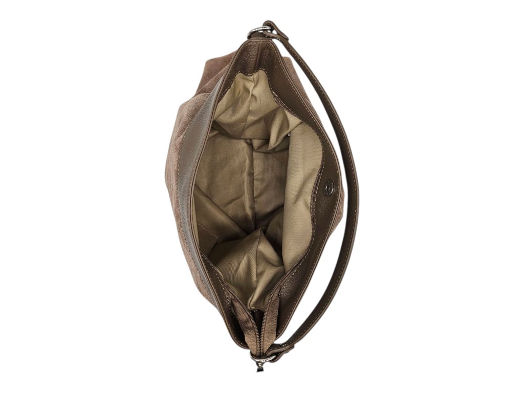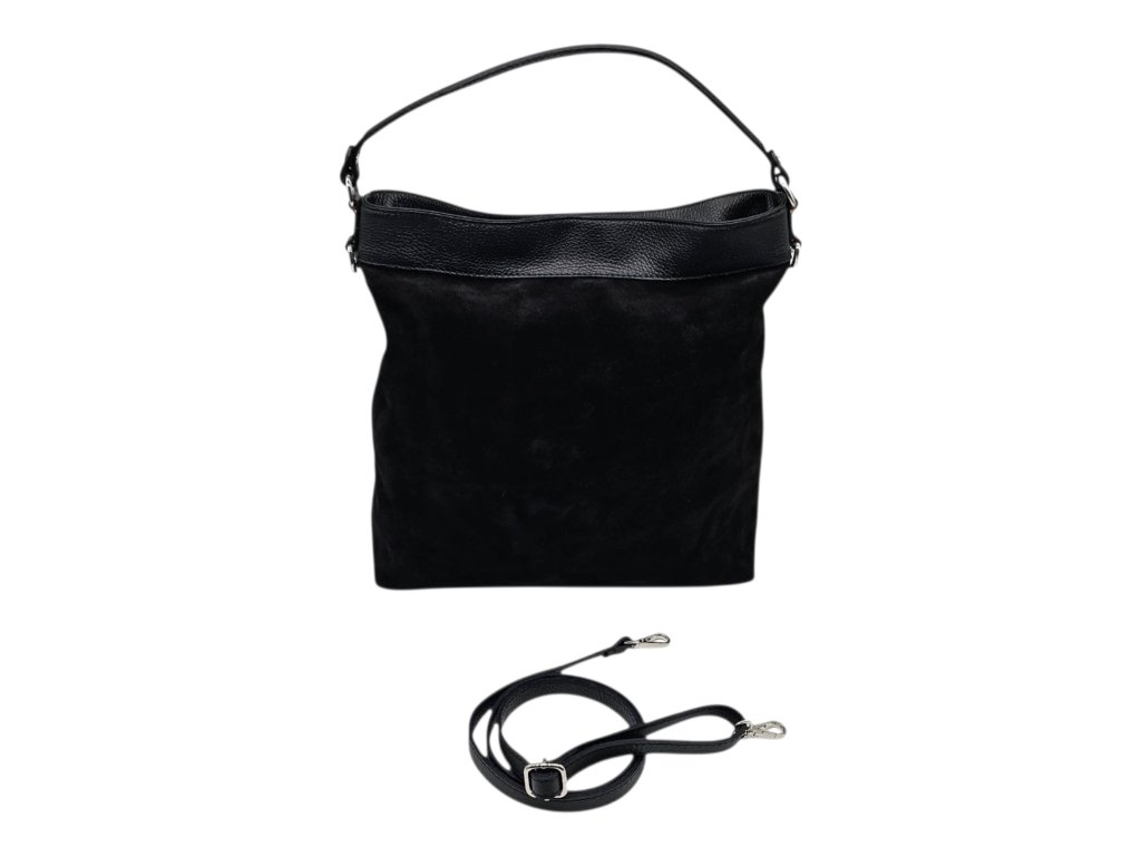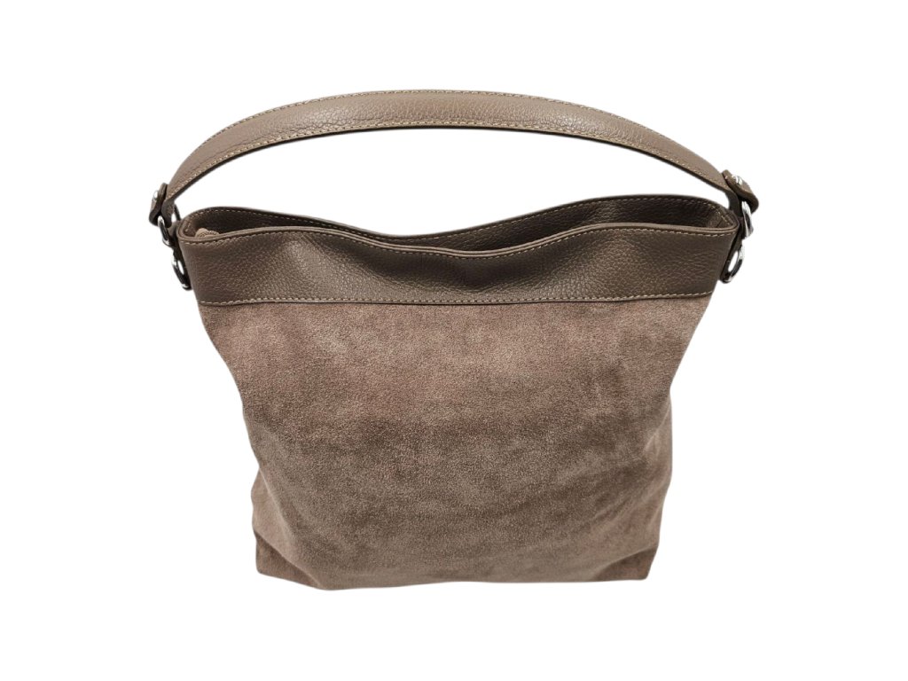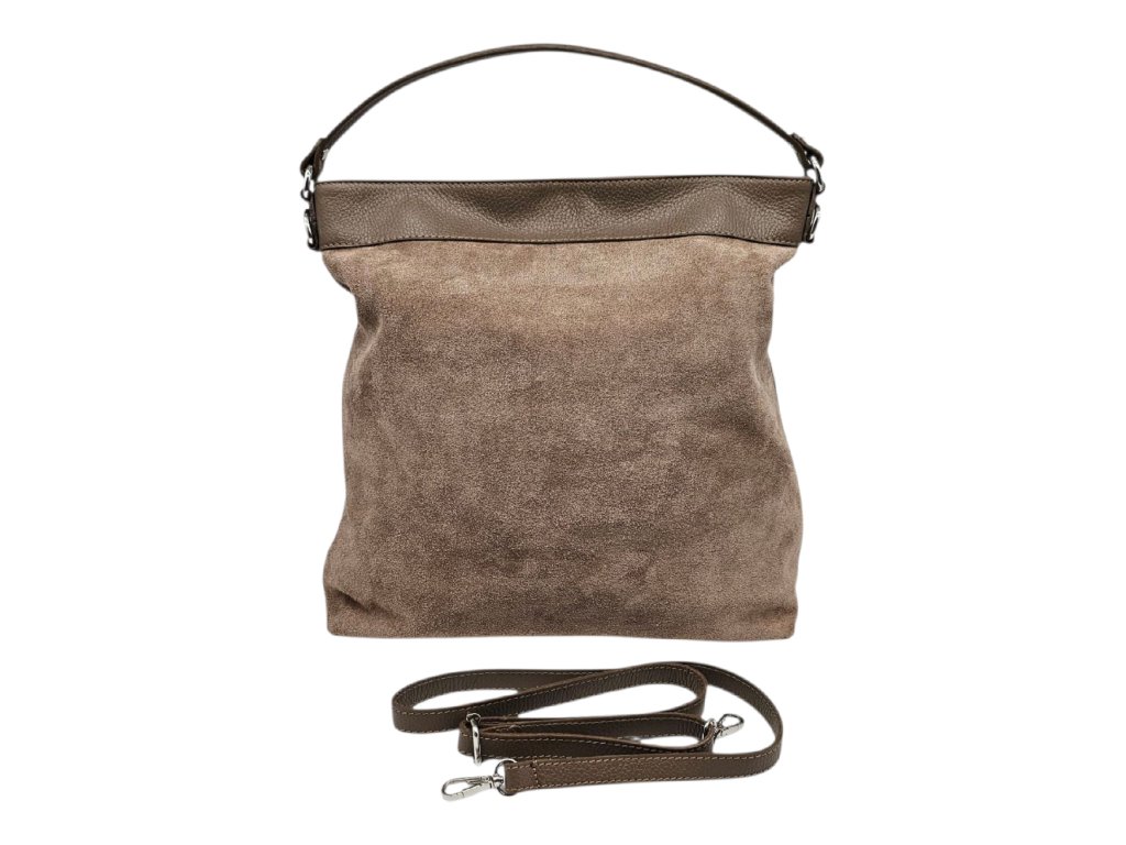 Prostorná kožená taška v kombinaci semiše a kůže, která má kapsu na zip a magnet. Hodí se na nošení jak na rameni, tak i do ruky. Součástí je i přiložený...